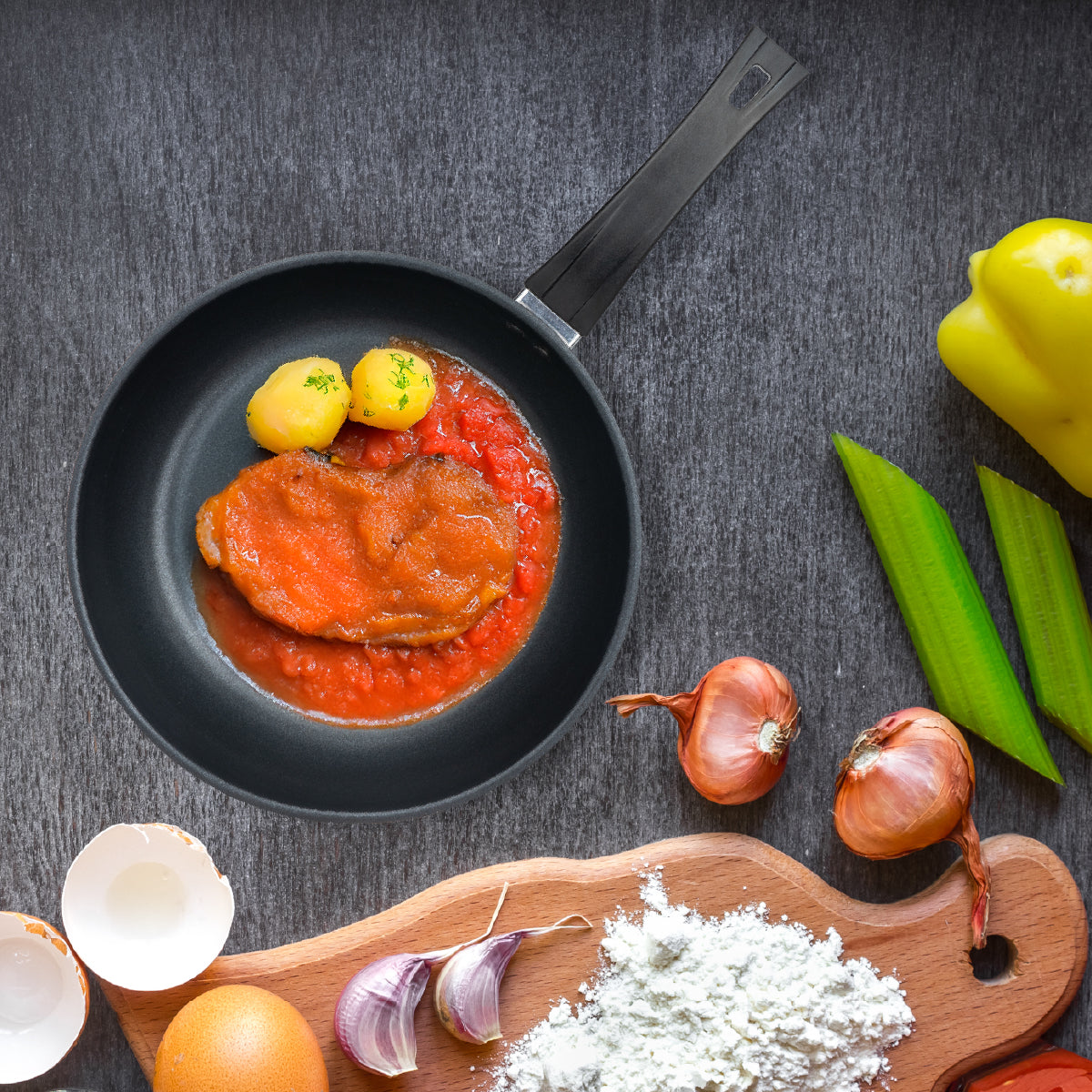 Sartén individual de 24 cm fabricada en acero inoxidable con recubrimiento antiadherente PPG Xylan Plus. Mango resistente al calor, base encapsulada compatible con todo tipo de estufas y 2 años de garantía. Ideal para el uso diario. |